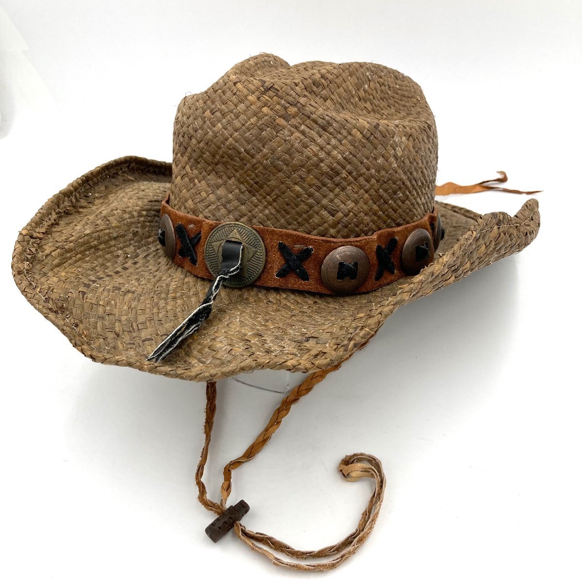 > 未使用品 MONTECARLO HAT モンテカルロ BULLHIDE バンド付き ストローハット ウェスタンハット Mサイズ テンガロンハット カウガール 茶
