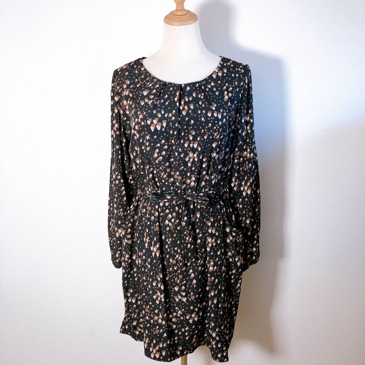 > WS0208 美品 ITS' DEMO イッツデモ レディース ひざ丈ワンピース 長袖 人気 ブラック 総柄 ポリエステル 万能 キュート ハート デート