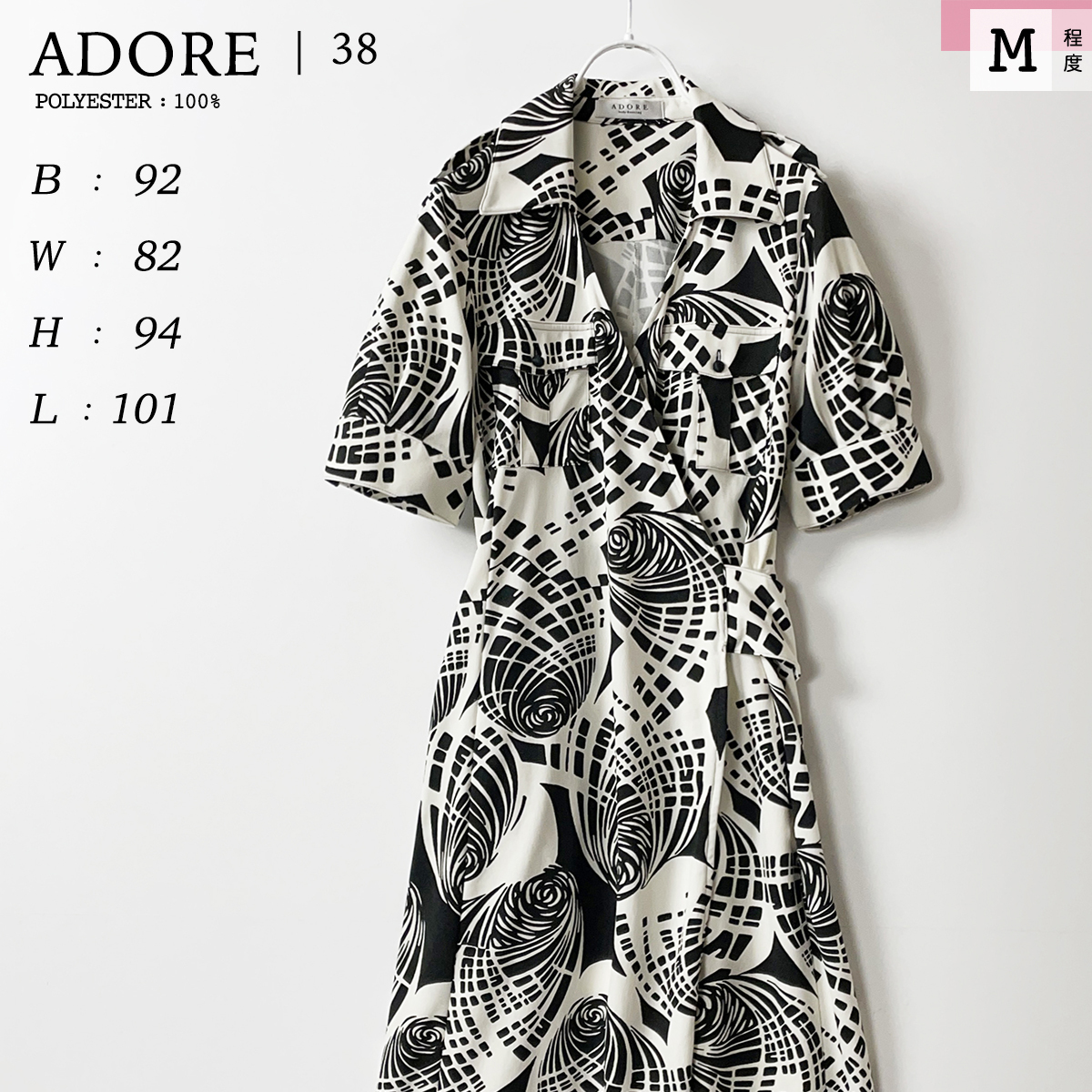 - ADORE カシュクール 半袖 シャツ ラップ ロング ワンピース 白 ホワイト 黒 総柄 ゼブラ 柄 襟 ウエスト 夏 アドーア 38 レディース M 9号