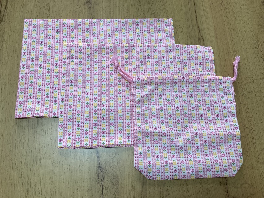 > 半額SALE ! ハンドメイド☆小学校ランチョンマット(2枚)&給食袋 40×60センチ(3)☆入学準備・ピンク・花