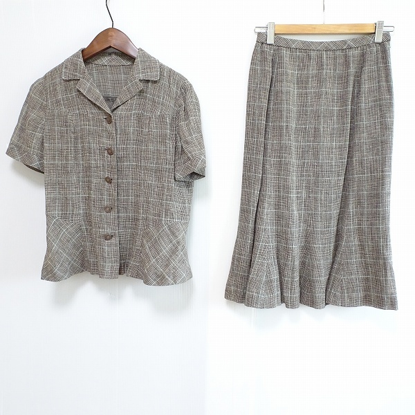 - #snc レリアン Leilian セットアップ ツーピース 9 グレー 麻 半袖 チェック ロング フレア レディース [836800]