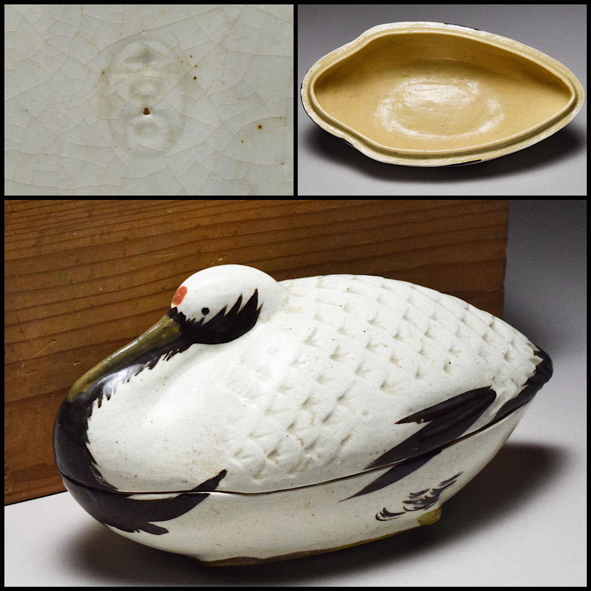 > 【八八八】初代 吉向十三軒 巣籠鶴蓋物 ◆合わせ箱付 大阪古陶磁 吉向焼 鶴形 菓子器 喰籠 喰篭 古作 時代茶道具 【d-152】