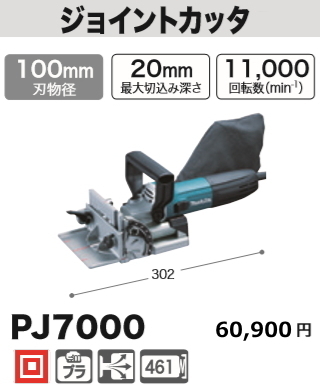 マキタ ジョイントカッタ PJ7000 定価60,900円(税別) ■簡単、そして確実に美しい継ぎ手加工・握りやすい細径ボディ ■3パターン溝位置調節 ・アングルガイド使用で部材表面より任意の位置に溝加工 ・アングルガイドを外せば部材表面より10mmの位置に溝加工 ・セットプレートを使えば部材表面より6mmの位置に溝加工 ■主要機能 刃物寸法(mm) 外形100x内径22 最大切り込み深さ(mm)20 回転数[回転/分]11000 電源 単相100v 電流7.3A 消費電力701w コード2.5m 質量2.3kg ■標準付属品 超硬カッタ・アングルガイド・ダストバック・セットプレート ロックナットレンチ20(782401-1)