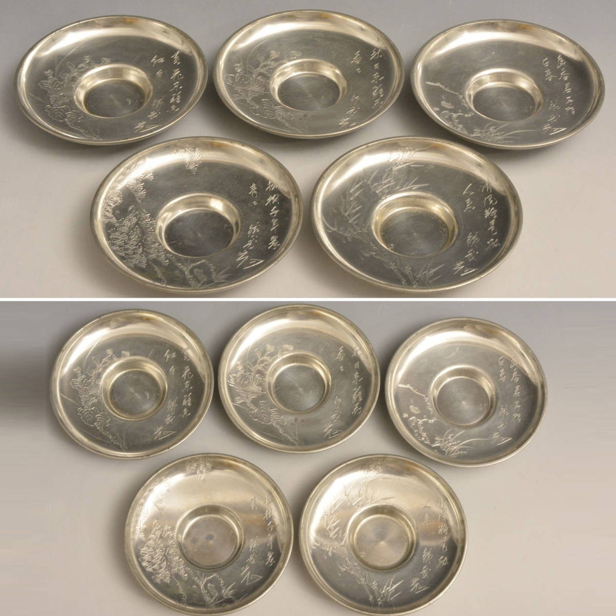 - T06335 錫製茶托 五君子彫鉄哉 五枚 407g:真作