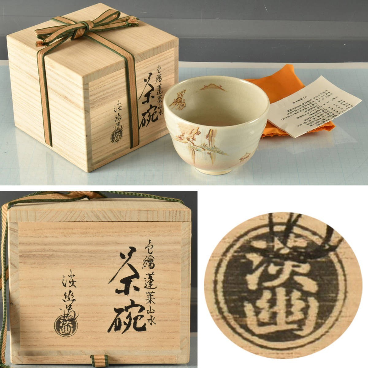 - B16538 林淡幽 色絵蓬莱山水茶碗 225g:真作