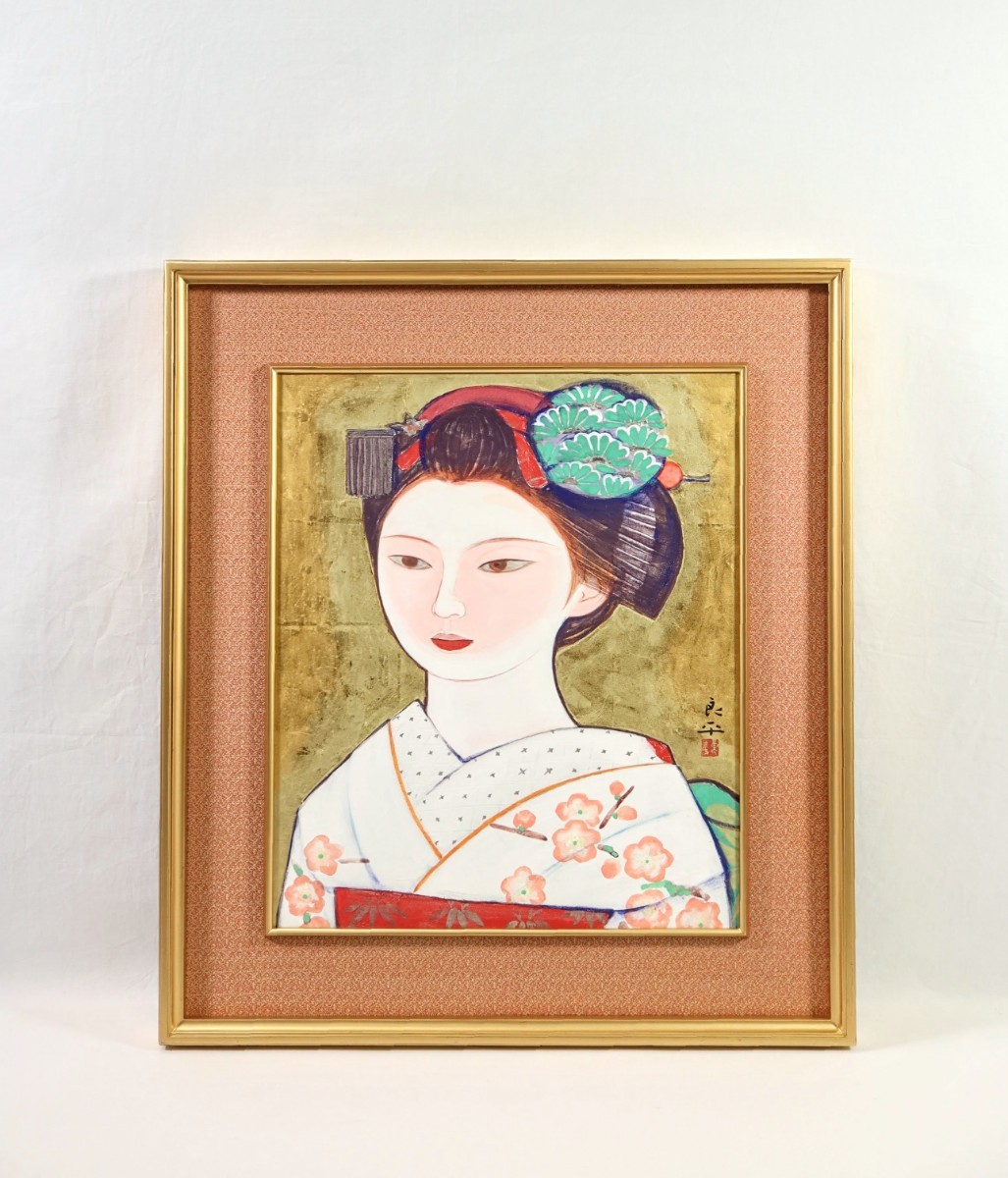 - 真作 三輪良平 日本画「舞妓」画寸 38×45.5cm 8号 京都府出身 日展評議員 山口華楊に師事 可憐で清らかな女性美を現代的な感覚で描く 7984