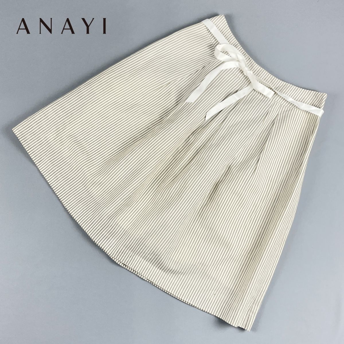 - 美品 ANAYI アナイ リネン ウエストリボン ストライプ フレアスカート 膝丈 裏地あり レディース ボトムス ベージュ サイズ36*HC551