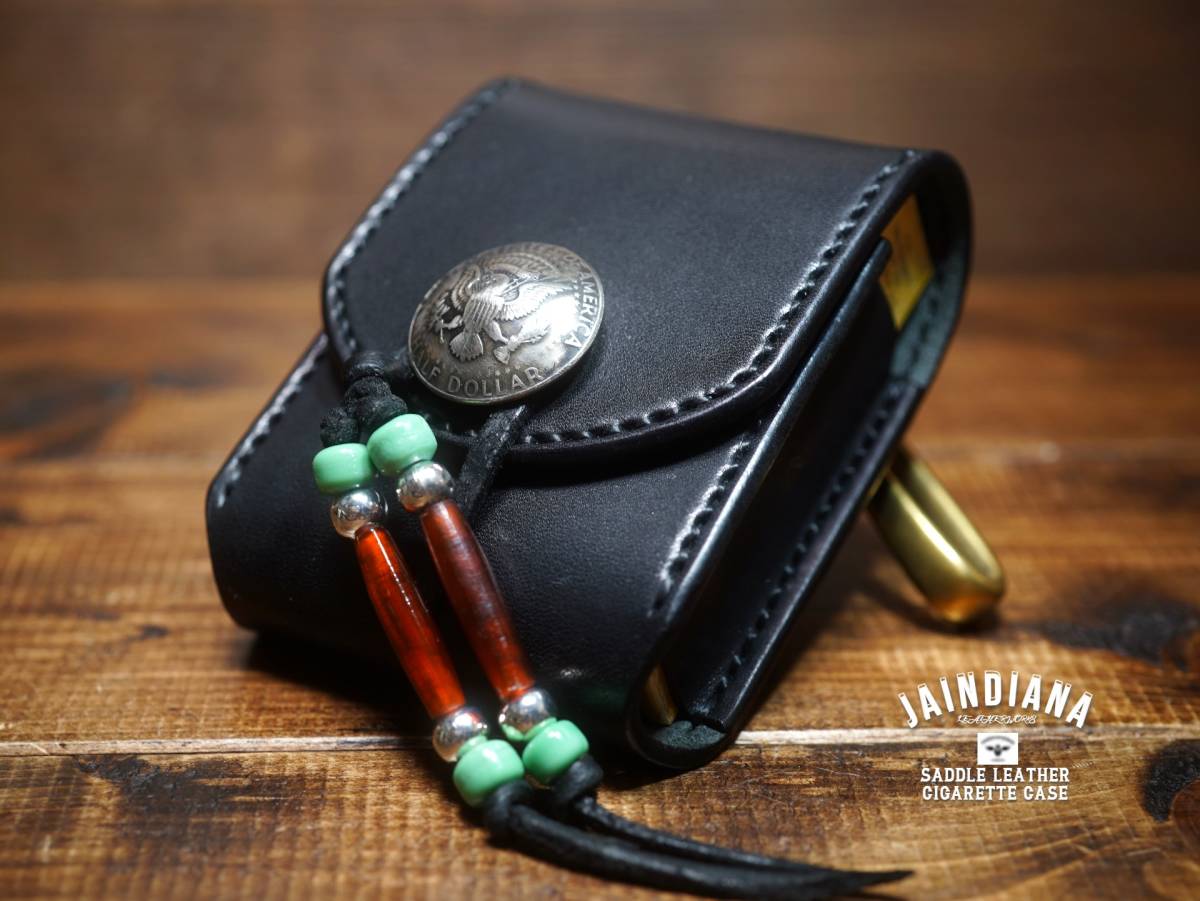 - 手縫い サドルレザー・タバコケース ブラック 真鍮フック付き 煙草ケース