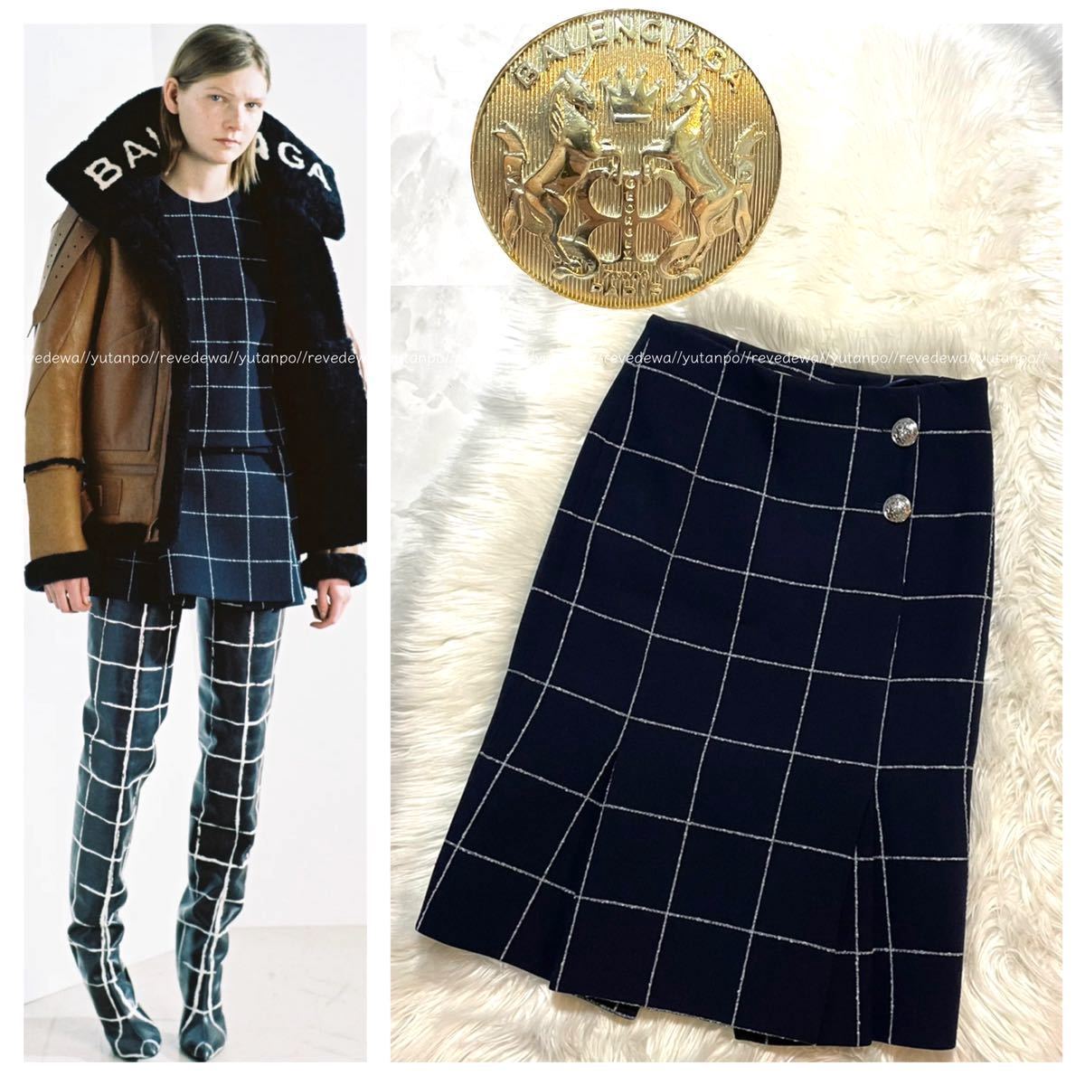 > 本物 美品 コレクションモデル バレンシアガ エンブレムボタン チェック柄 フリル スカート 紺 36 BALENCIAGA