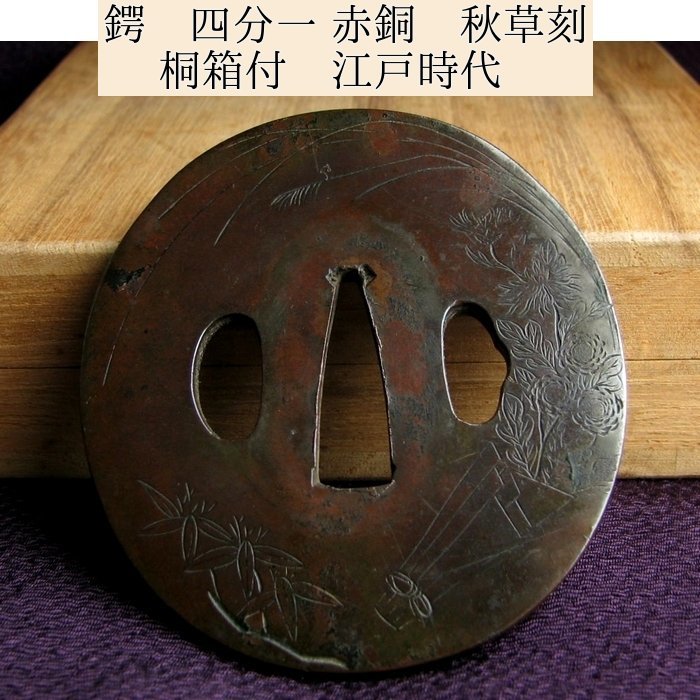 - 時代武具 鍔 四分一 赤銅 秋草刻 桐箱付 江戸時代/鐔/23j009
