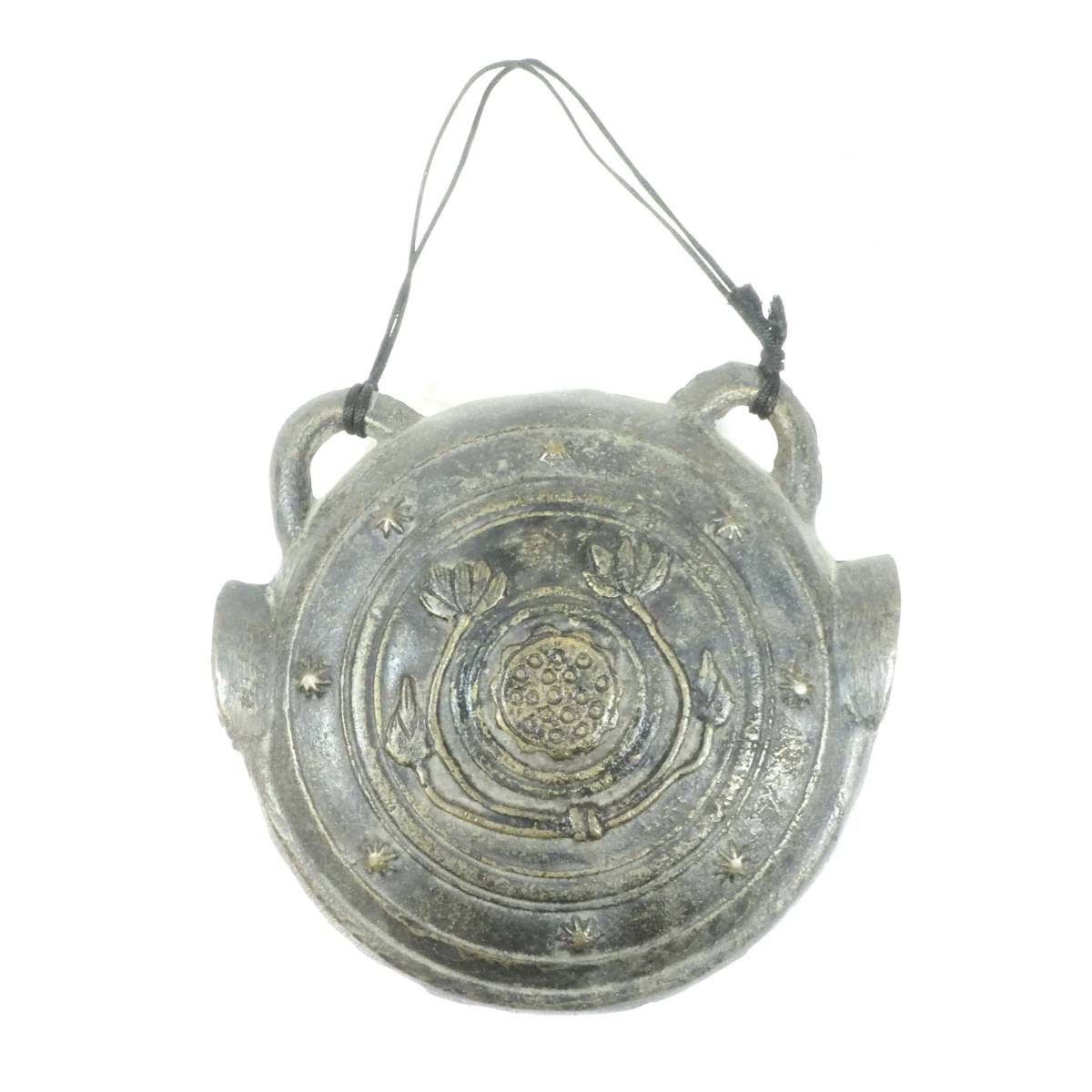 - 仏教美術 古玩 銅製 蓮の花紋鰐口 釣り鐘 仏具 鰐口鳴物 鈴 鐘 金属工芸 鋳物 直径13cm 紐の長さ10cm TNI510