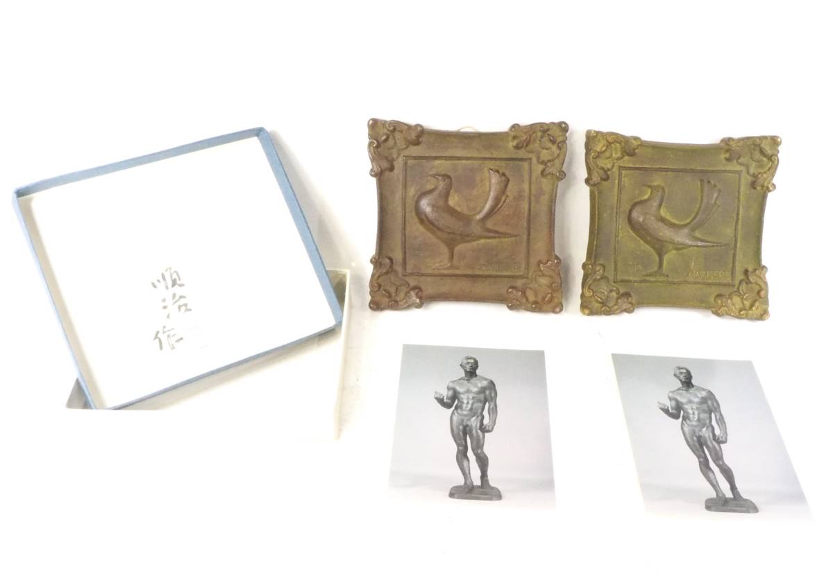 - 昭和ビンテージ 彫刻家 元日展理事 分部順治作 「鳩」レリーフ 2点 第15回日展の絵葉書2枚 壁掛け陶製レリーフ 共箱 1980年代 TNI510