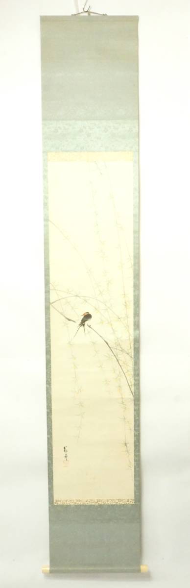 > 味わいによる雰囲気が素敵! 昭和ビンテージ『柳つばめ』墨彩画 日本画 紙本掛軸 在銘品 落款有 箱無し 長さ201cm 幅34cm TNI510