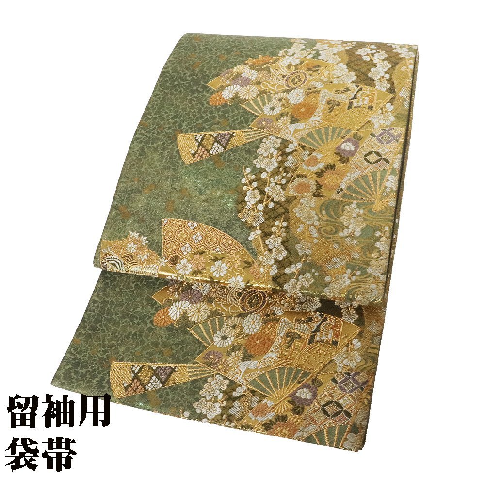 > 留袖用 袋帯 正絹 緑 金箔 梅 菊 桜 鼓 花菱 扇子文 Mサイズ F6695 美品 レディース シルク ギフト 七五三 結婚式 入学式 送料込み