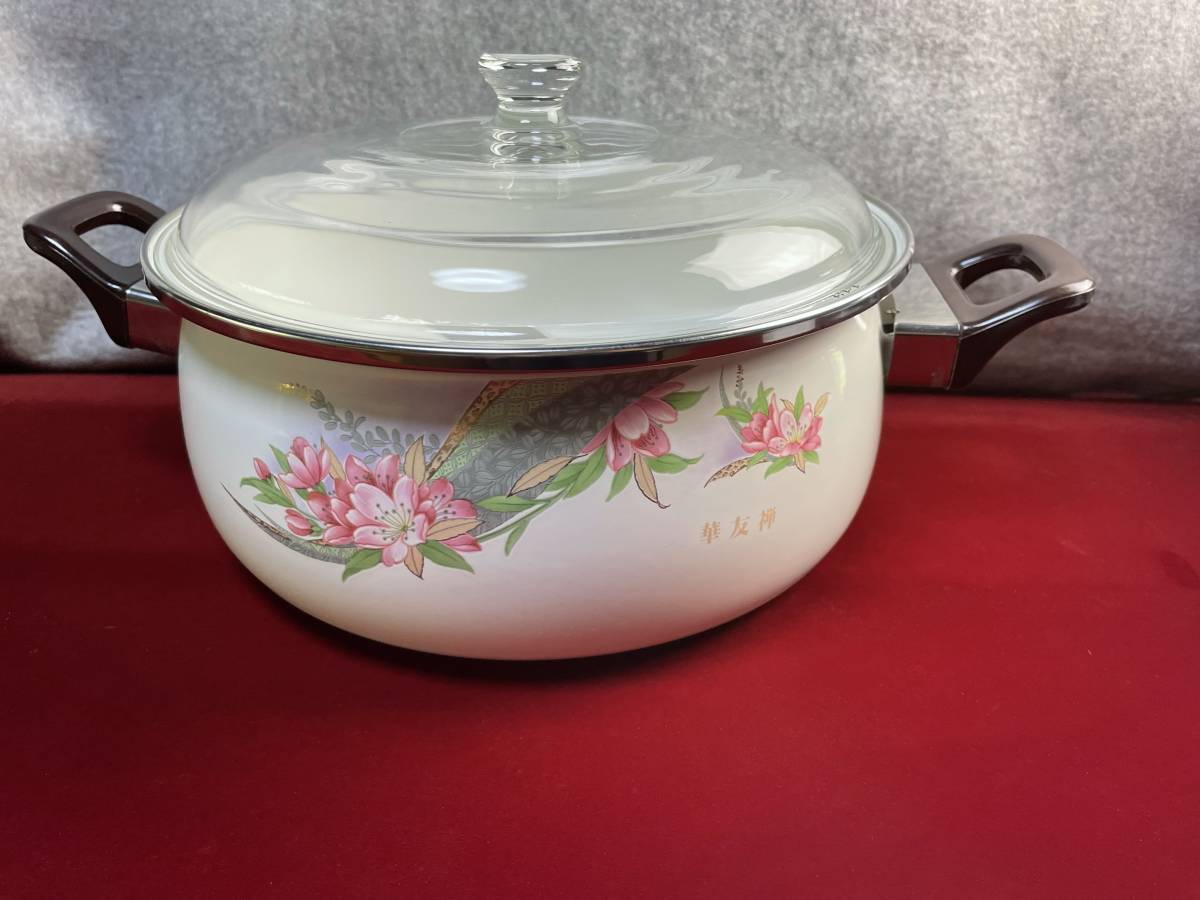 - 昭和レトロポップフラワー柄 ガラスの蓋付 キャセロール 琺瑯両手鍋 直径:30cm