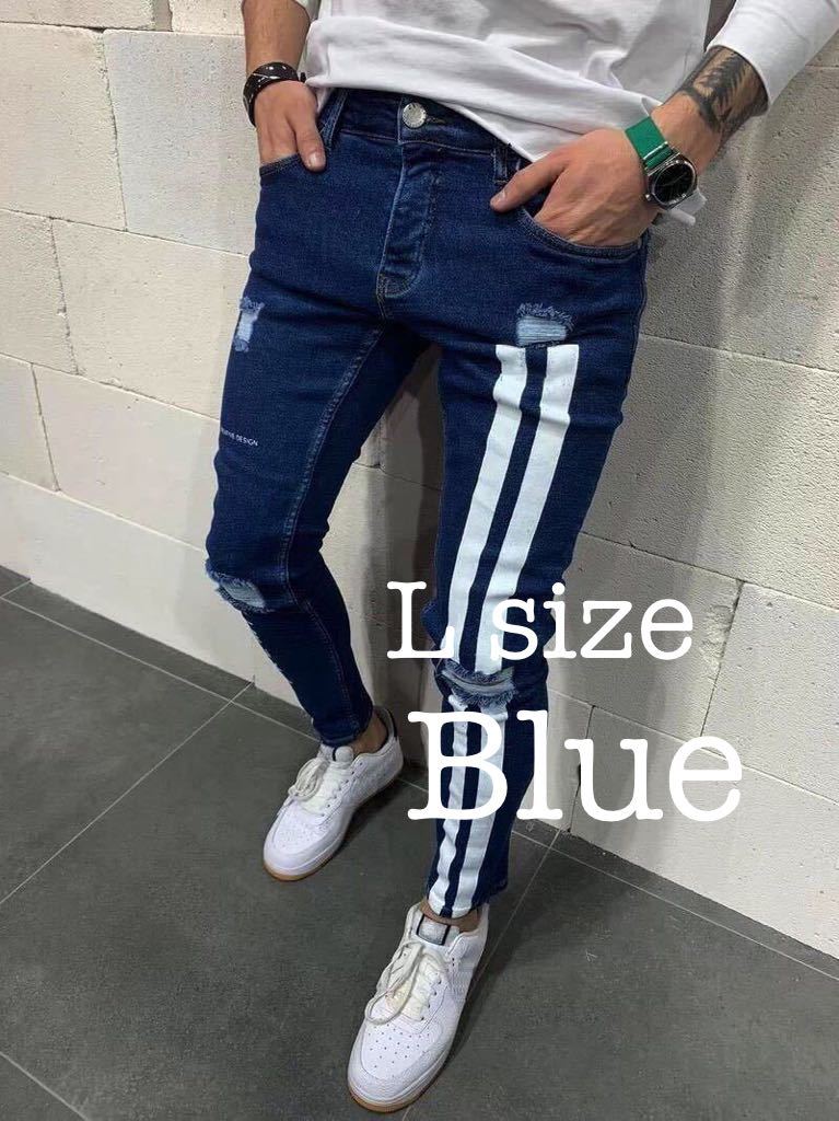- デニム ジョガーパンツ ラインパンツ テーパード ジーンズ ユニセックス 男女兼用 ブルー L