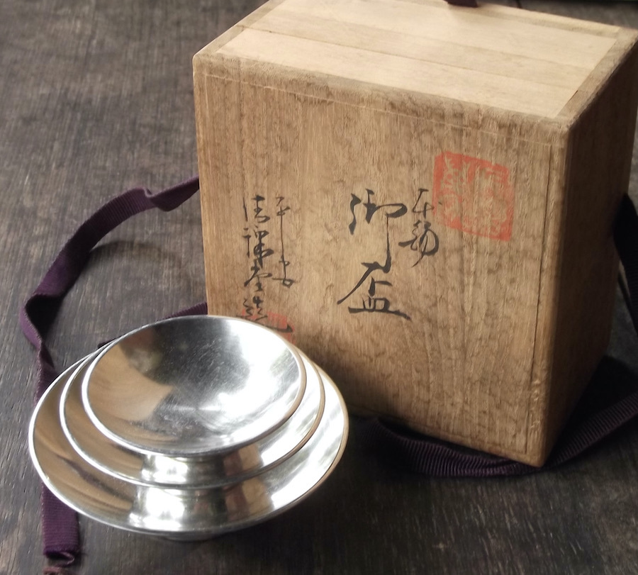 - 昭和 レトロ 本錫 重ね盃 平安 清課堂造 錫器 酒器 杯 記念品 70年代 金属工芸品