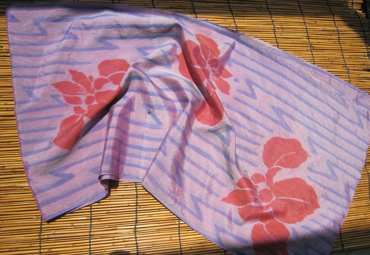 ■正絹 昨今貴重になってきている銘仙から手作りの帯揚げ布です。藤紫と薄青に大き目の薄渋紅色の菖蒲が印象的。