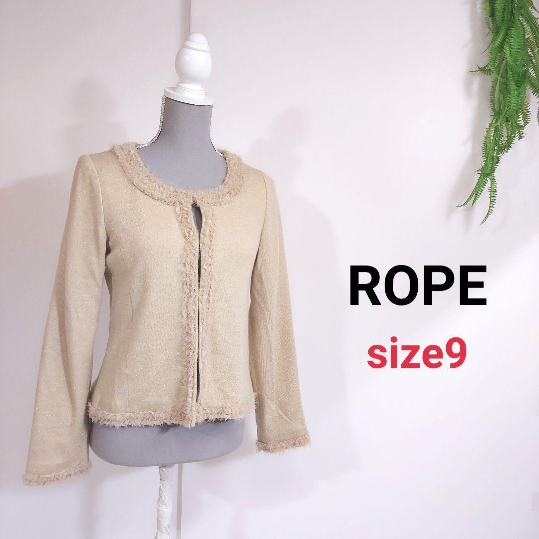 > ROPE ラメ混ノーカラージャケット・ベージュ・シャギーシフォン飾り 表記サイズ9号 M ロペ 79825
