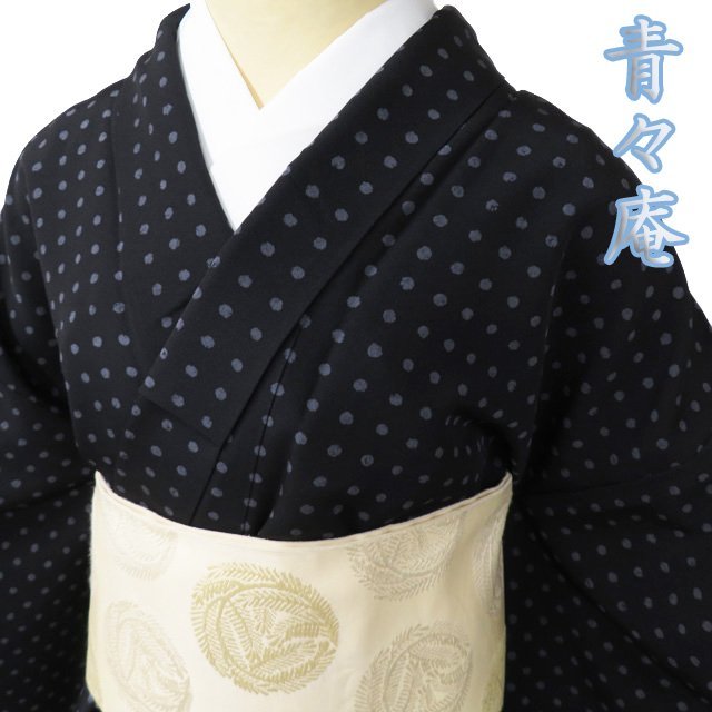 > 特選 小紋 着物 中古 正絹 袷 カジュアル 青々庵 水玉模様 黒色 鼠色 身丈167.5cm 裄70cm L トール きもの北條 A946-8