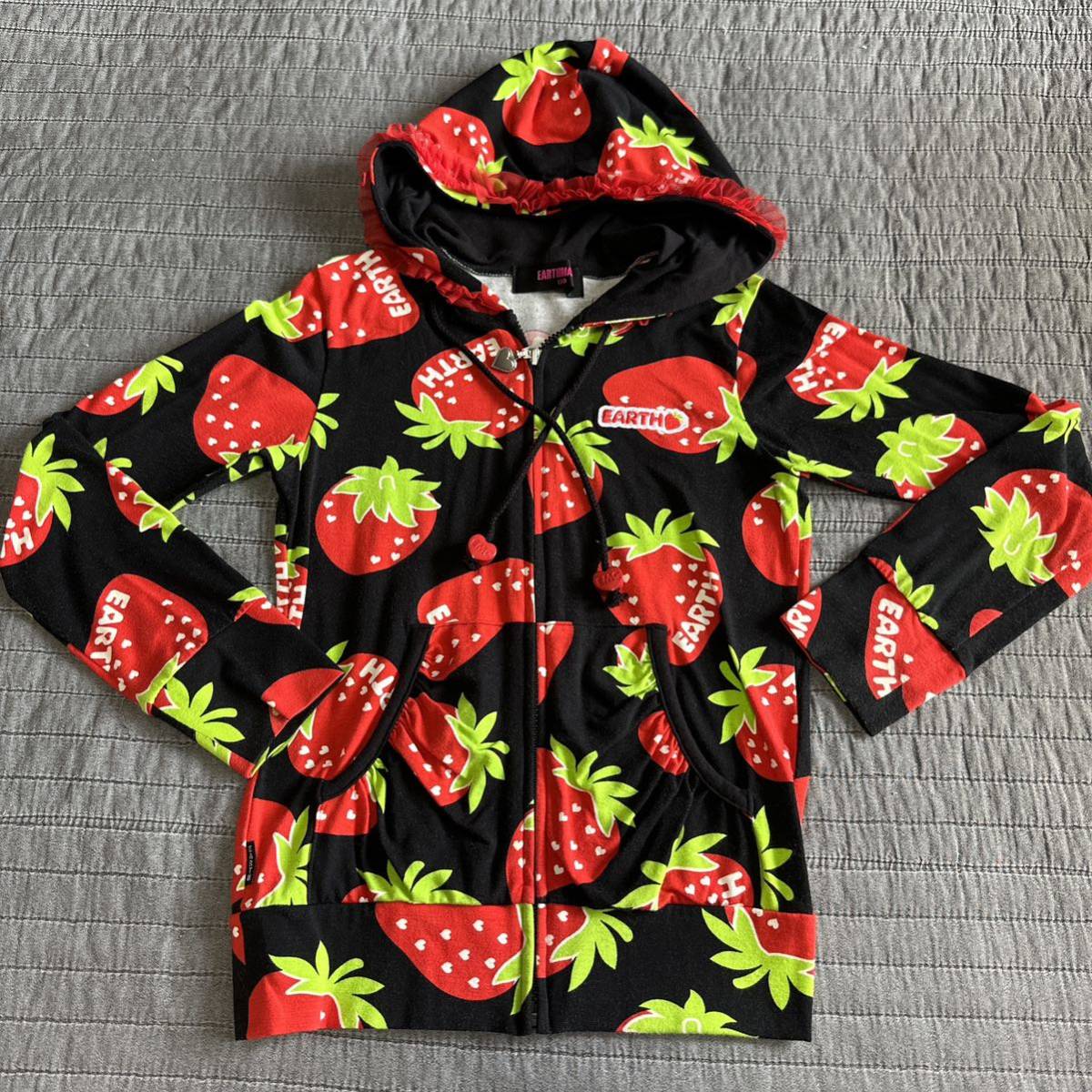 - 2回着用EARTHMAGICアースマジック いちご柄チュールジップアップパーカー 女の子 キッズ パーカー フルジップ フリルレース 130