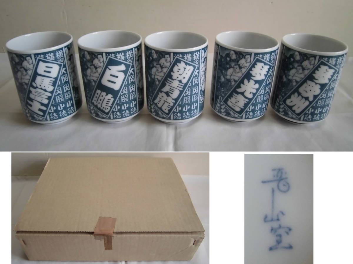 - 湯呑み茶碗 相撲柄 晋山窯 5客 箱入り 日馬富士 白鵬 朝青龍 琴光喜 琴欧洲 相撲土産 染付 茶器 陶器 工芸品 レトロ