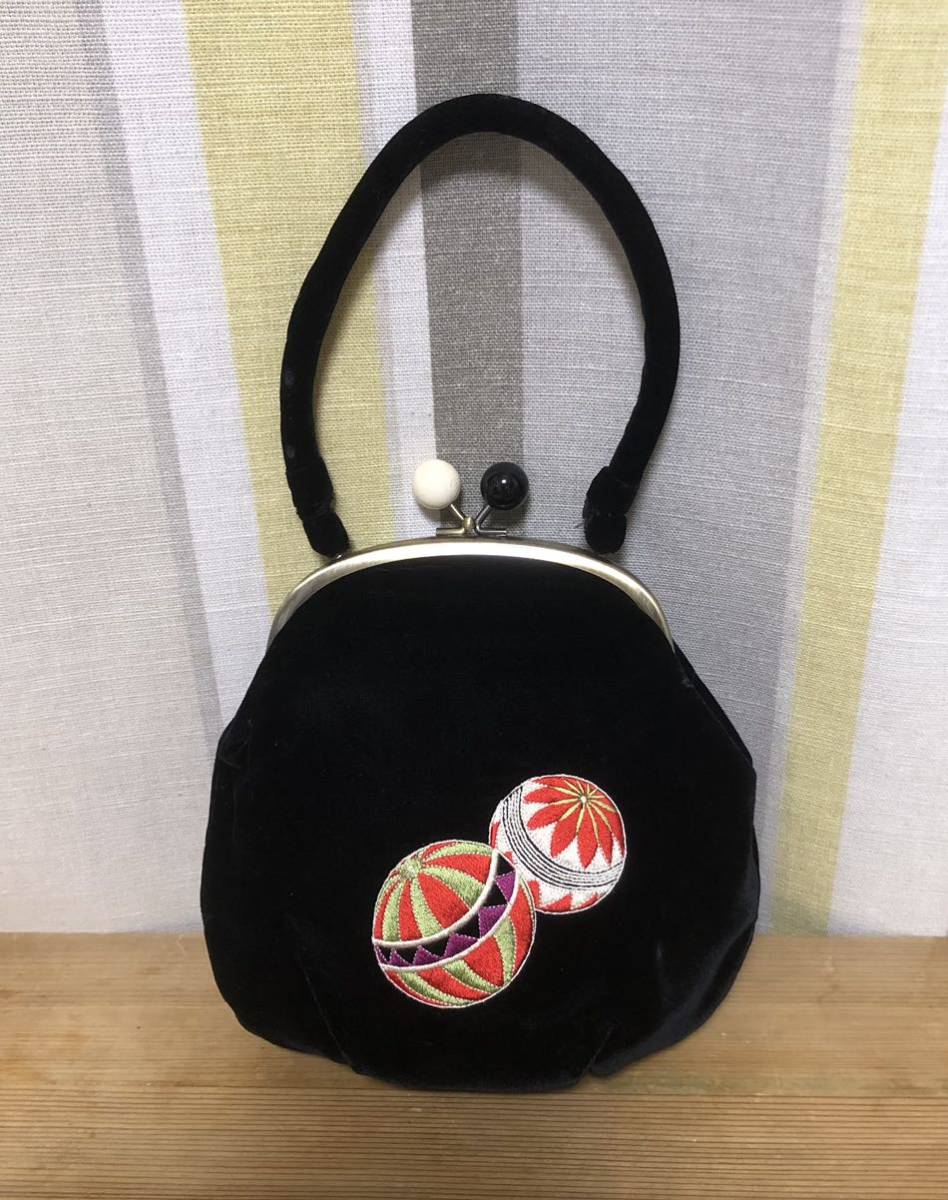 - 【2回使用】ふりふ★バッグ★ベロア刺繍「まりぼんぼん」★ブラック★毬 手鞠 風船 振袖 着物 成人式 卒業式 結婚式 古典 レトロ★和装★袴