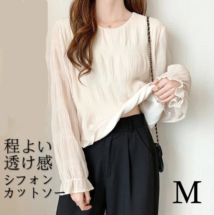 > 送料無料★新品 程よい透け感 長袖 シフォン カットソー シャーリング フリル トップス レディース★オフホワイト/M