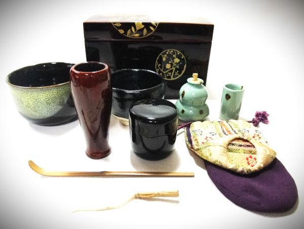 - 【睦】野点 青貝 螺鈿 金蒔絵 茶箱 天然木 本漆器 抹茶茶碗2 振出 棗 茶巾筒 茶筅筒 羽箒 茶匙 全8点■