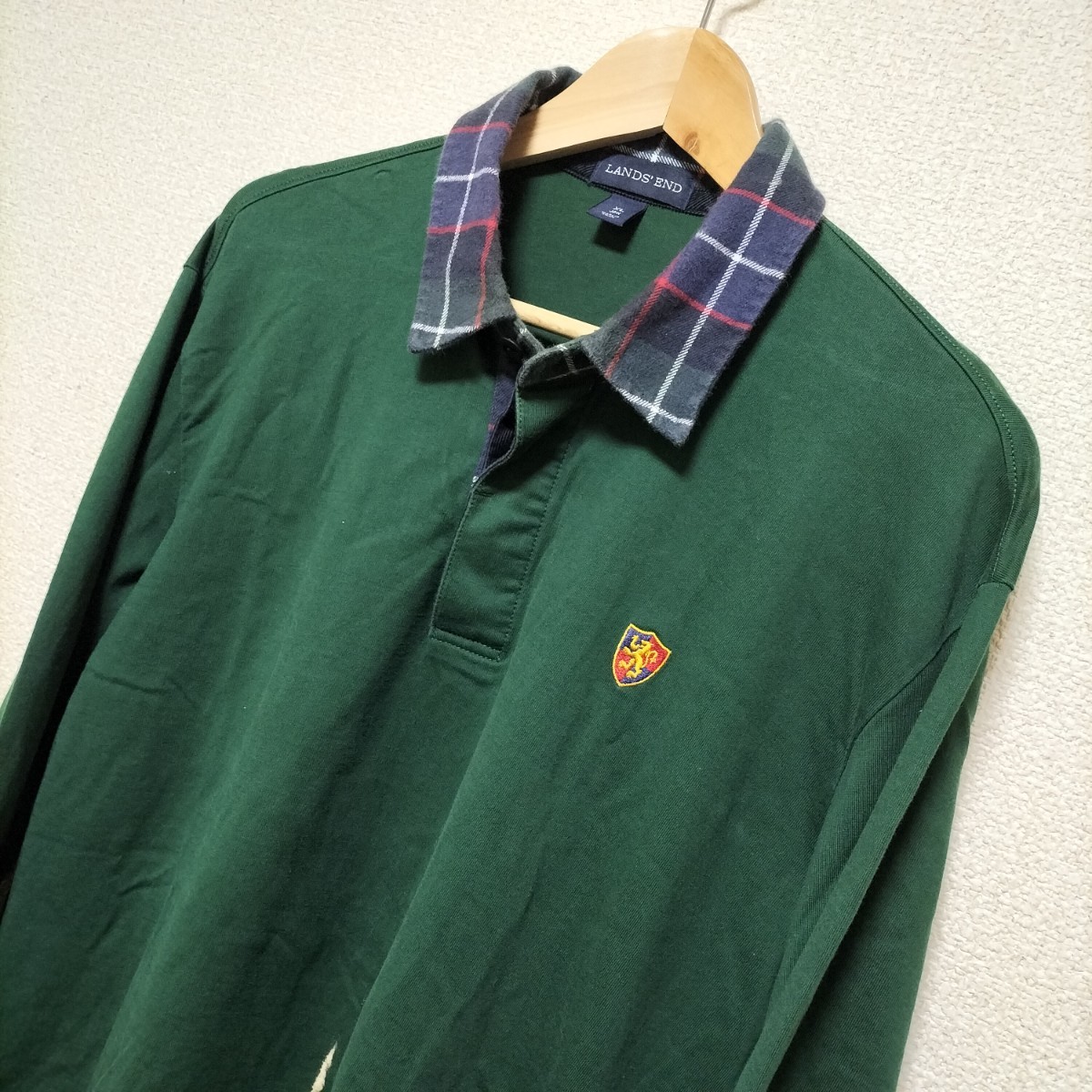 > ★LANDS'END 長袖ポロシャツ ロンT 襟チェック柄 コーデュロイ素材 メンズ サイズXL トップス グリーン ランズエンド ブランド古着 USED