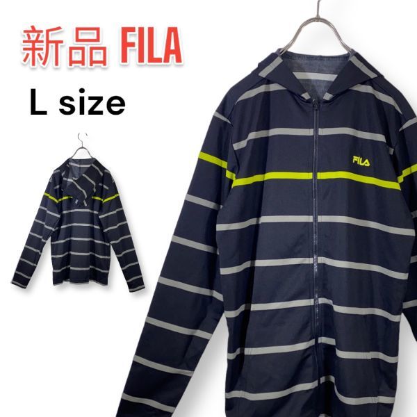 > FILA フィラ 薄手生地 ジップアップ パーカー ポリエステル Lサイズ ブラック 黒 ボーダー ロゴ刺繍 日焼け対策 UVカット 伸縮性