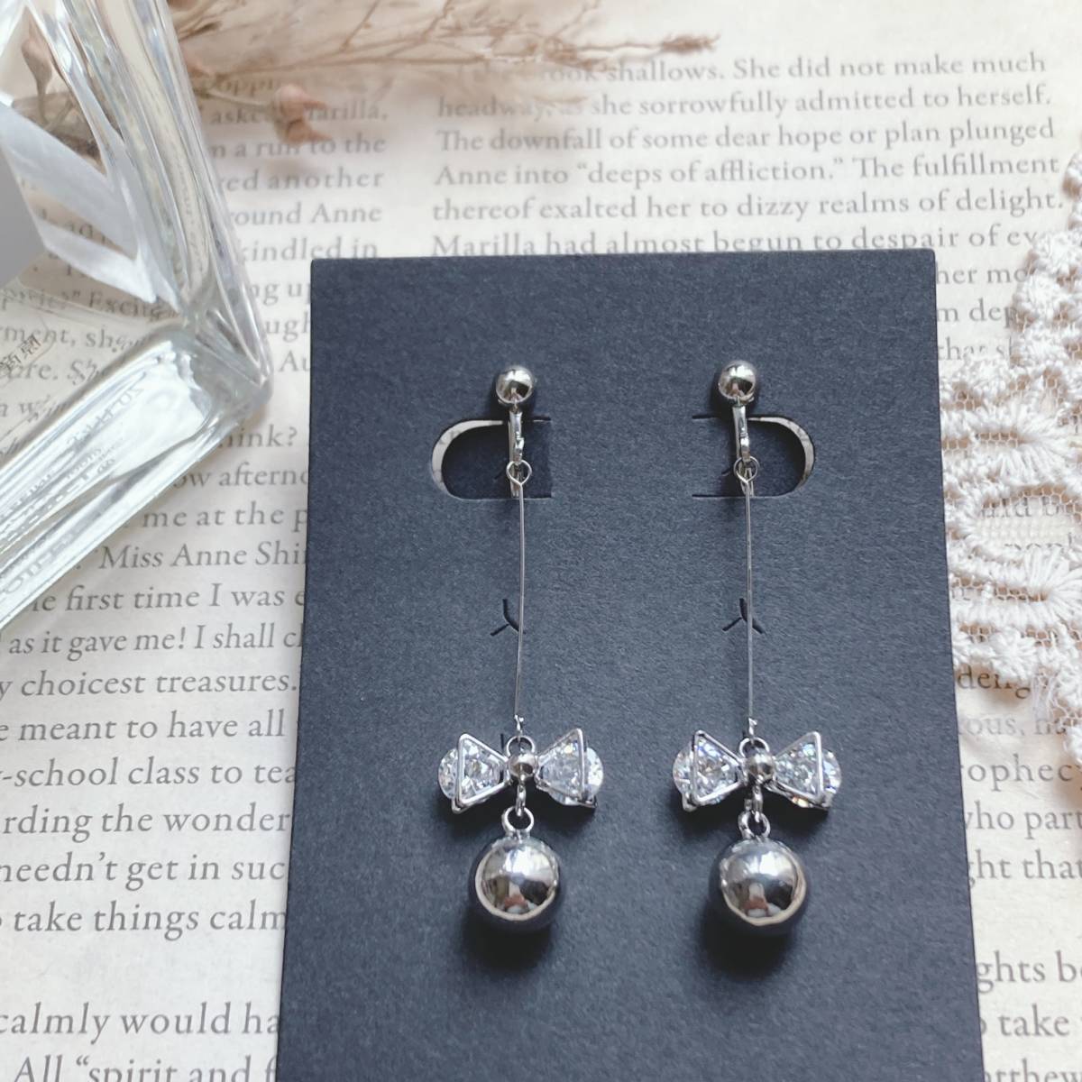 > イヤリング シルバーメタル ボール ガラス玉 リボン ゆらゆら キラキラ 美品☆Vintage jewelry accessories A0896
