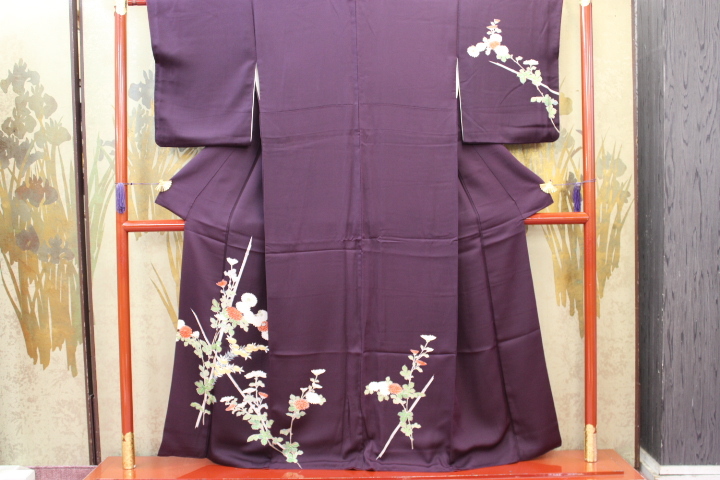 > きもの今昔6336 付け下げ訪問着 広衿袷手縫い仕立て 正絹梨地綸子生地 紫色地竹に菊の花柄 身丈152cm