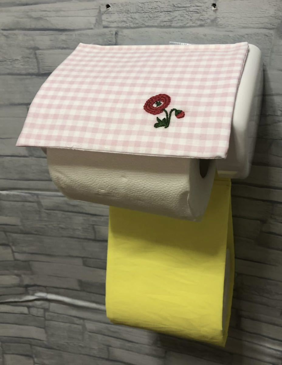 - 手刺繍 トイレットペーパーホルダーカバー 刺繍 花 ギンガムチェック ハンドメイド
