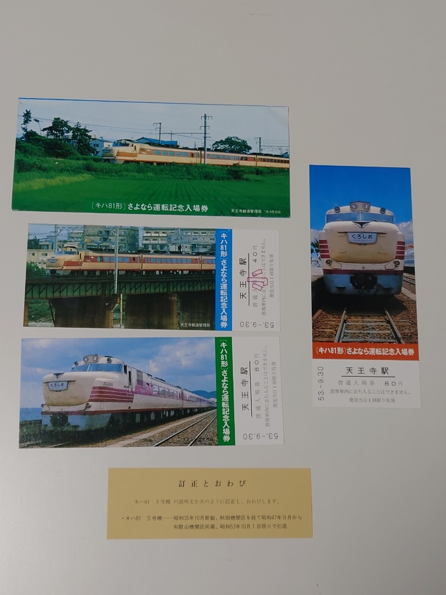 - キハ81形 さよなら運転記念入場券 3枚組 天王寺駅 国鉄 記念入場券 お詫びと訂正文付