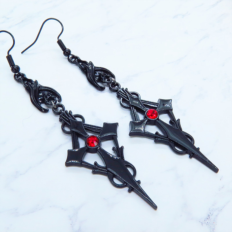 - ブラックに輝く十字架のブラッククロスピアス ロザリオ ゴシック パンク ロック メタルブラック