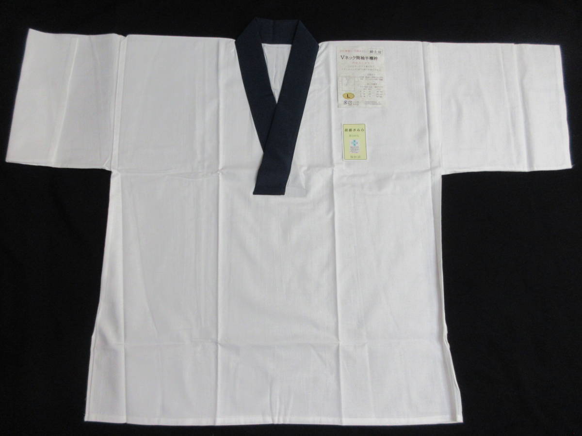 - ☆☆Vネック 筒袖 白半襦袢 (綿) 紺衿 御仕事着、作務衣の下 Lサイズ 38911