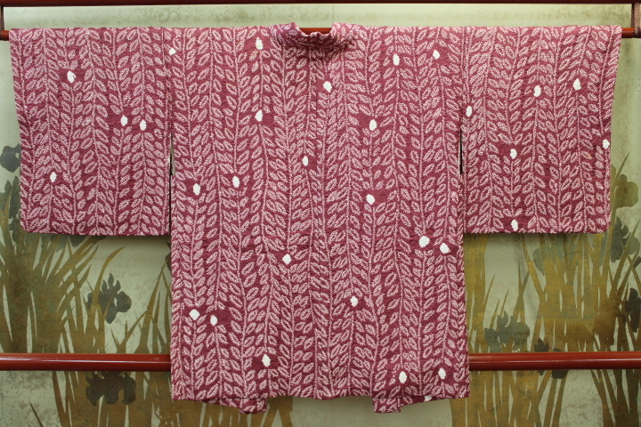 - きもの今昔6517 お羽織コレクション 四つ巻きの総絞りワイン色 藤の花柄 羽織紐付き 羽織丈79cm