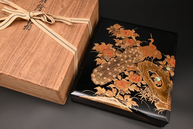 > 時代漆器 傑作 硯箱 ■金縁黒塗内金梨地 金切箔螺鈿 豪華 唐松孔雀牡丹硯箱■高金蒔絵[御所車 桔梗] 天然木 書道具 古美術 木箱入№9472■