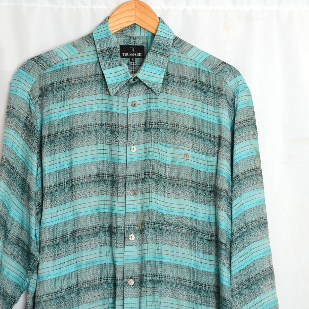 > AS280 トラサルディ TRUSSARDI 長袖シャツ 5 / XL 肩48 麻 格子柄 メール便発送可 xq