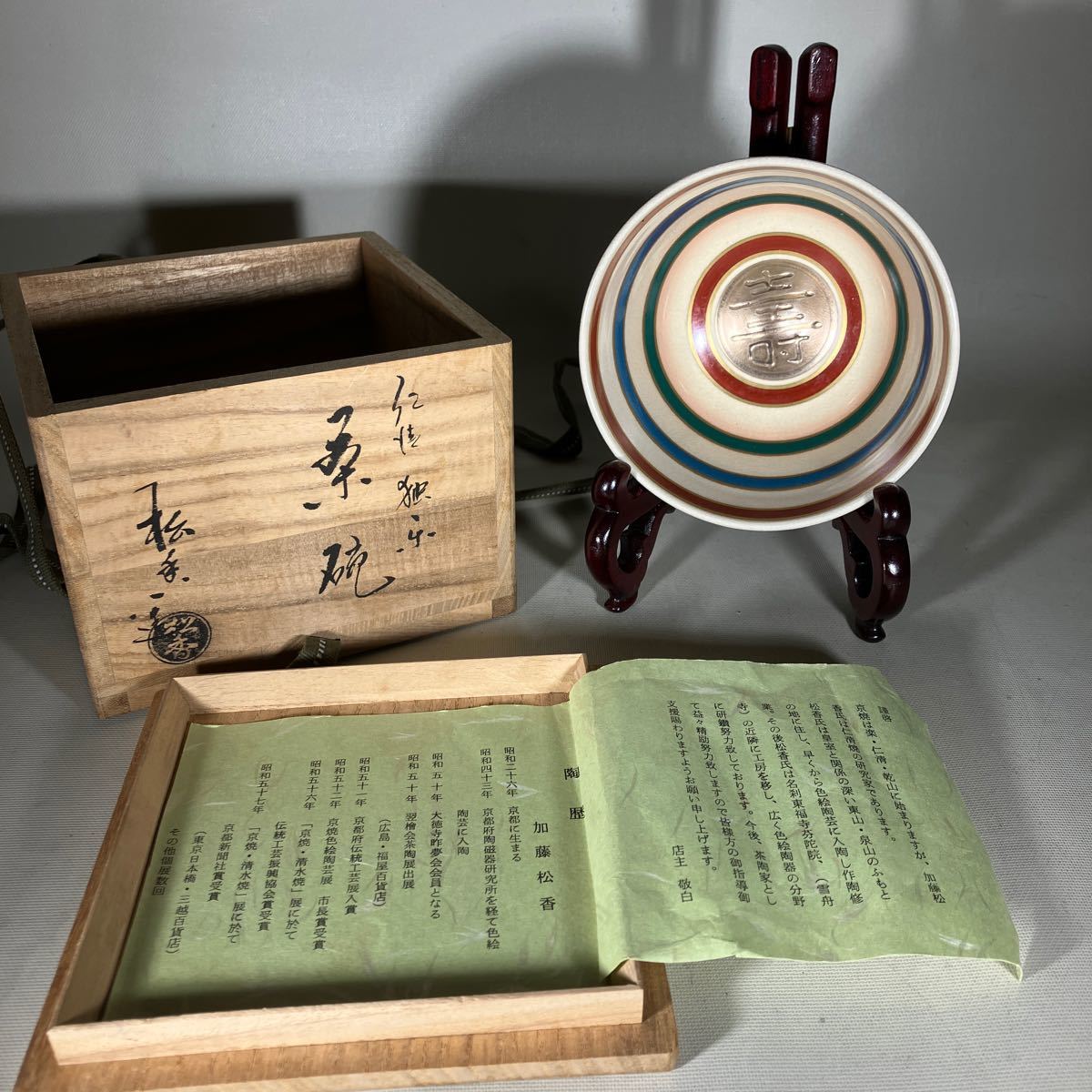 - 加藤松香造 京焼 深茶碗 共箱 共布 色絵 陶暦 八八八