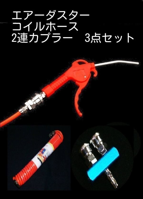 - エアーダスター、エアーコイルホース9m、エアー2又分岐カプラー2連カプラー中ジョイント付き3点セット!点検済み