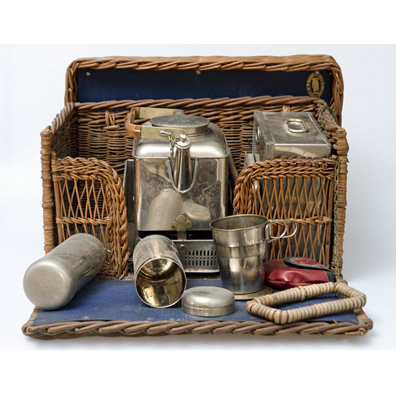 - 英国製アンティーク 藤製のピクニック・バスケット ニッケルシルバー製のティー・セット