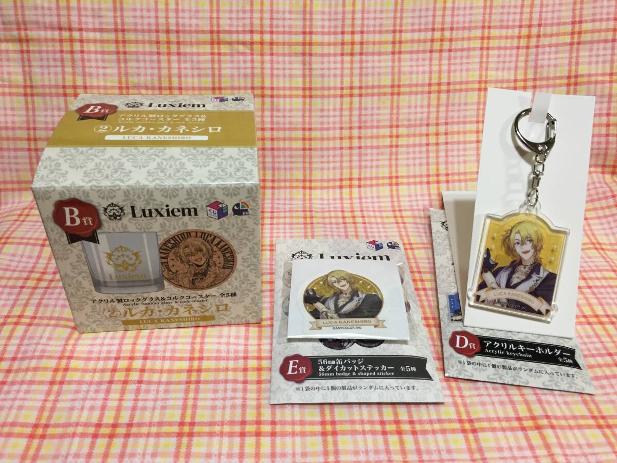 - Luxiem くじスクエア ルカ・カネシロ 3点セット B賞:ロックグラス&コースター D賞:キーホルダー E賞:缶バッチ&ステッカー