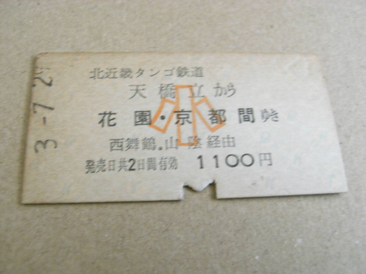 - 北近畿タンゴ鉄道 天橋立から花園・京都間ゆき 西舞鶴.山陰経由 小1100円 平成3年7月29日 天橋立駅発行