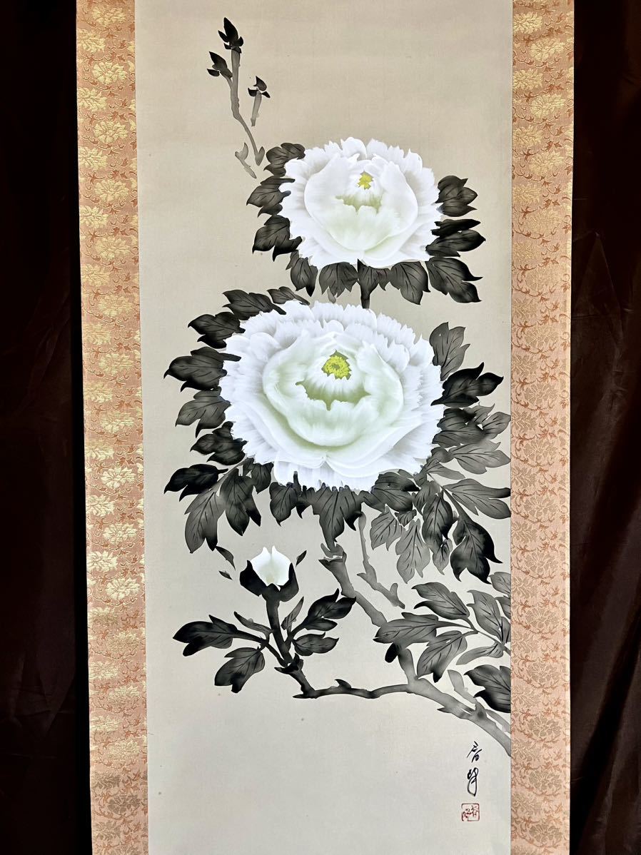 - [模写] [S8] 春峰「牡丹」絹本 花図 茶掛け 日本画 絵画 掛軸