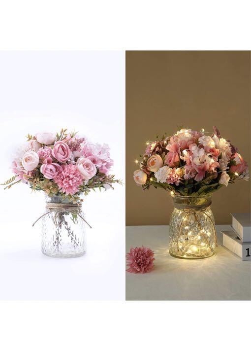 - ピンクバラ造花 ガラス花瓶付き LEDムードライト インテリア飾りテーブルのセン