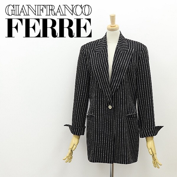 > ヴィンテージ◆STUDIO FERRE0001 ジャンフランコフェレ 刺繍 ストライプ柄 1釦 ジャケット 黒 ブラック×ホワイト 42