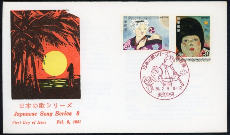 - 0178 【FDC】日本の歌シリーズ第8集「子もり歌・椰子の実」[東京中央/56.2.9/JPS創作版画]