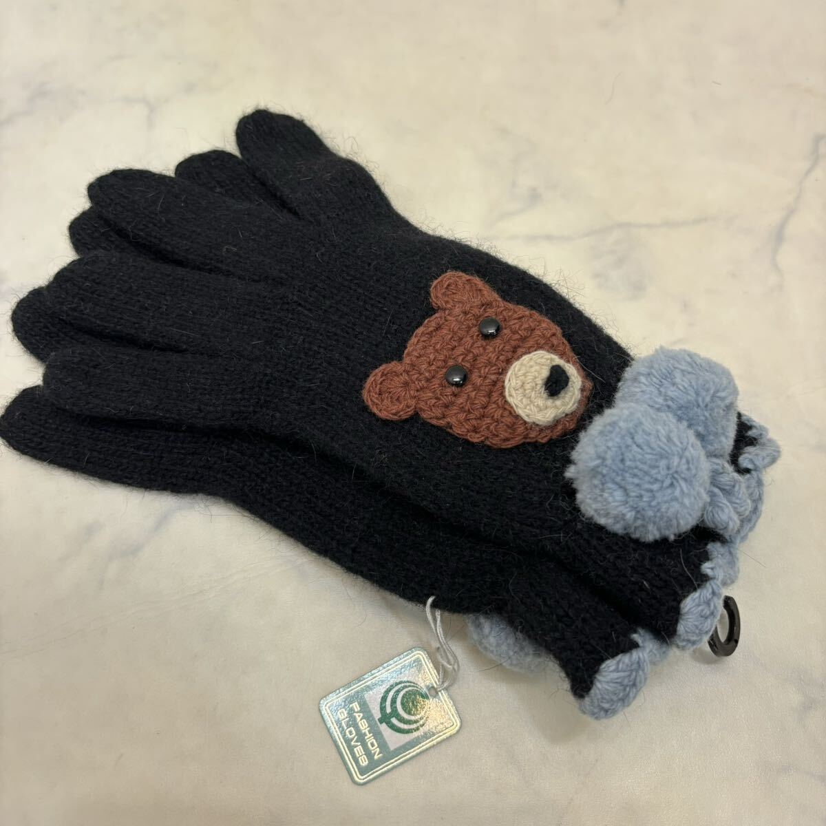 - 新品 タグ付き 手袋 グローブ ウール混 ニット 編み くま レディース サンエース 黒 ブラック